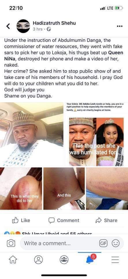 It has gotten to my knowledge that the Kogi state’s Commissioner for Water Resources Mr. Abdulmumuni Danga physically and sexually assaulted Ms Elizabeth (going by the Facebook profile Queen NiNa) for a post she made on Facebook days ago.